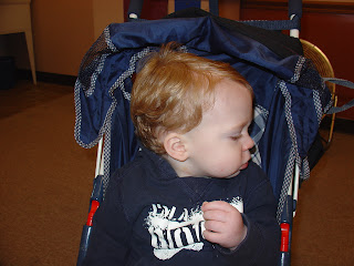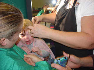 Oh my goodness, I took both my kids in to get a haircut today and it was the first haircut for my 14 1/2 month old. I had him in my lap and the hair capes we were wearing pretty much did nothing. It is a good thing that my hair dresser is a friend because I think if it were anyone else they would have quit and my son would probably be lop sided. Nancy is a trooper and his hair looks great!